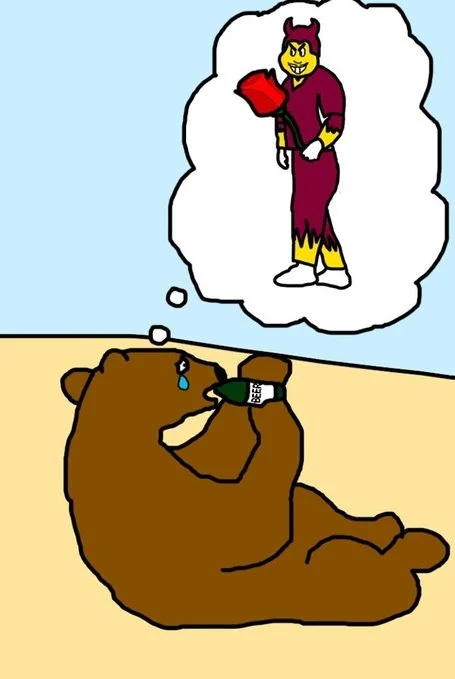 The few followers of the Golden Bear that were able to resist the temptation of intoxication were able to cast a spell on the Sun Devil to keep him from being successful in the future. Those loyal followers wanted to make sure that the Sun Devil would never be able to take the Golden Bear's power again, and that Sun Devil would not be able to keep the power that it had taken from the Golden Bear. The spell also made it much harder for the Sun Devil to defeat the Golden Bear on the field of battle. Even during the dark years of the Holmoecaust, the Golden Bear was able to defeat the Sun Devil more often than not. The last time the Sun Devil was able to beat the Golden Bear in its glorious home in the Canyon of Strawberries was many a year ago when the Sun Devil still had the support of the great Snyder. Also, because of the spell, only once in the past decade has the Sun Devil beaten the Golden Bear. That one failure happened in the Devil's lair in the valley of the sun, and was during the curséd collapse that was caused by a large, river-dwelling rodent. Now, the Sun Devil feels as if the spell is wearing off and that he should be able to defeat the Golden Bear in the Canyon of Strawberries this Saturday. The Golden Bear, however, does not believe that the spell is wearing off and will continually remind the Devil, that the Canyon of Strawberries is BEAR TERRITORY.